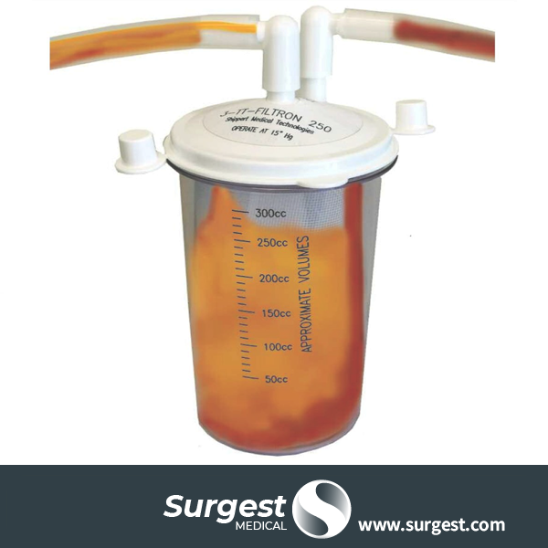 El contenedor Tissu-Trans FILTRON es colocado en línea entre la cánula de aspiración y el depósito de desechos de sistema de vacio.
