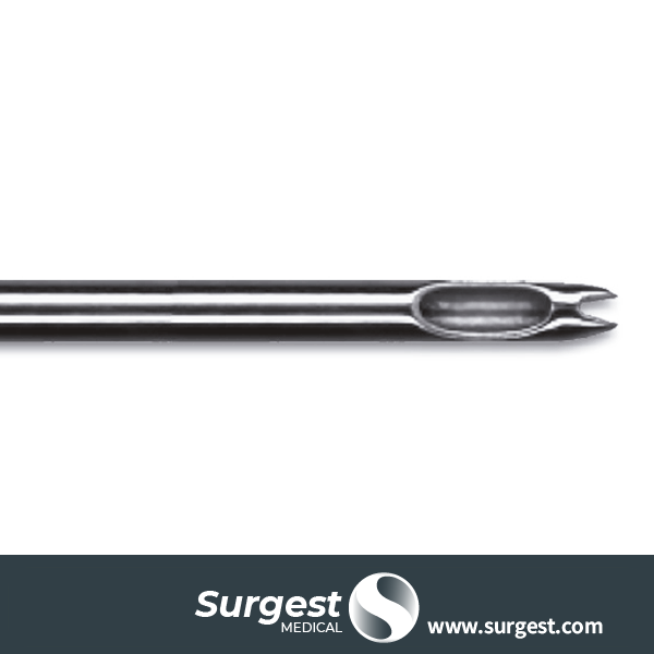Cánula V Disectora, tiene la punta terminada en “V” y el orificio está situado ligeramente más lejos del extremo distal. Las dos puntas que conforman la “V” permiten penetrar en tejidos