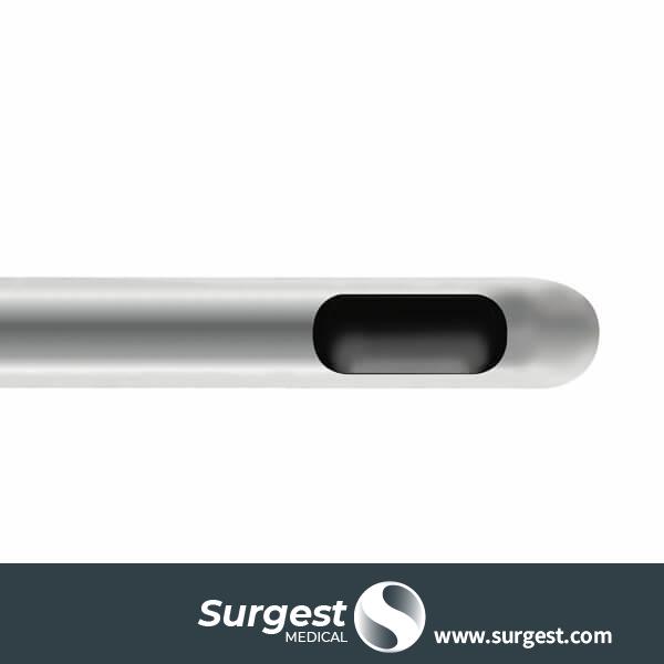 Punta atraumática y recubierta con un lubricante que reduce el traumatismo de la zona receptora, mientras que el orificio lateral único permite una infiltración de grasa precisa y exacta.