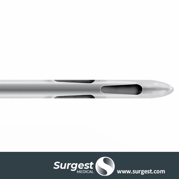 Cánula de recolección circunferencial de 6 orificios diseñada con el Dr. Hoyos. Los orificios de lágrima y 360 ° de potencial de cosecha lo convierten en la cánula ideal para la recolección de grasa en grandes volúmenes y varios planos.