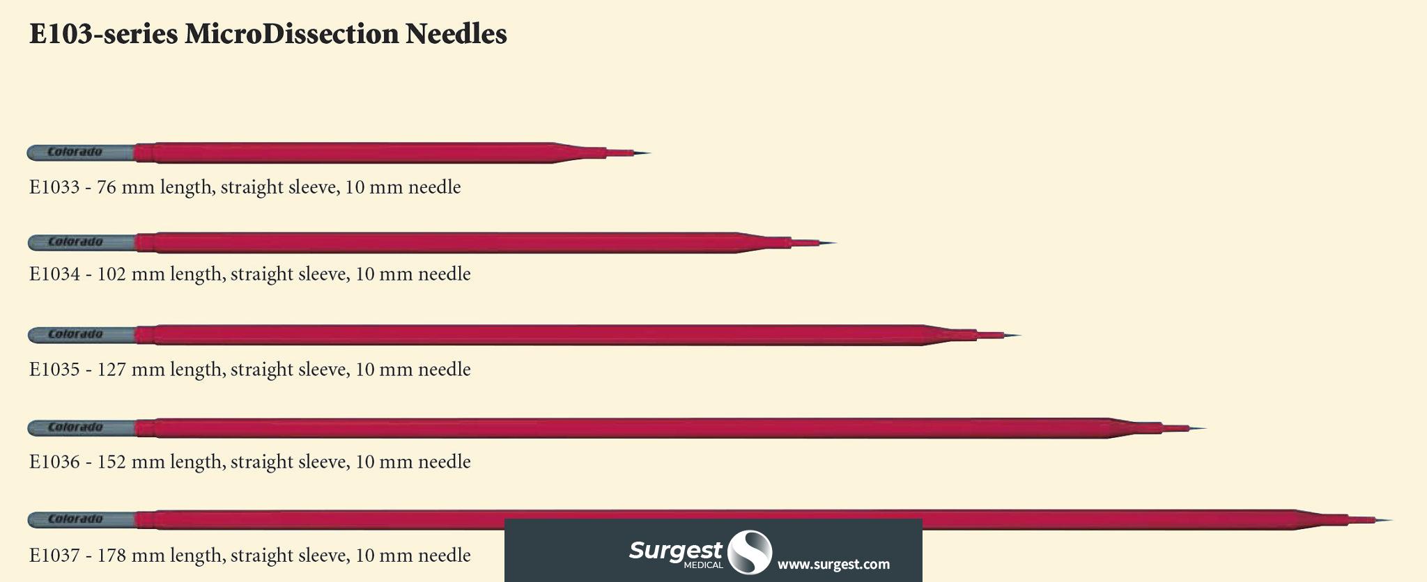 La aguja de microdisección Colorado es el terminal de electrobisturí más preciso del mercado, su tamaño (ver foto comparativa) y el materíal con el que esta fabricado permite una disección extrmadamente precisa, Por sus características necesita menor potencia y transmite la onda eléctrica mucho más localizada, reduciendo el daño de los tejidos circundantes e incluso el humo durante la intervención.