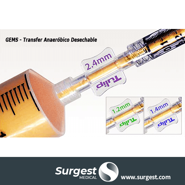 Descripción: GEMS · Transfer Anaeróbico Luer a Luer Estéril, Desechable de 2,4mm · Tulip